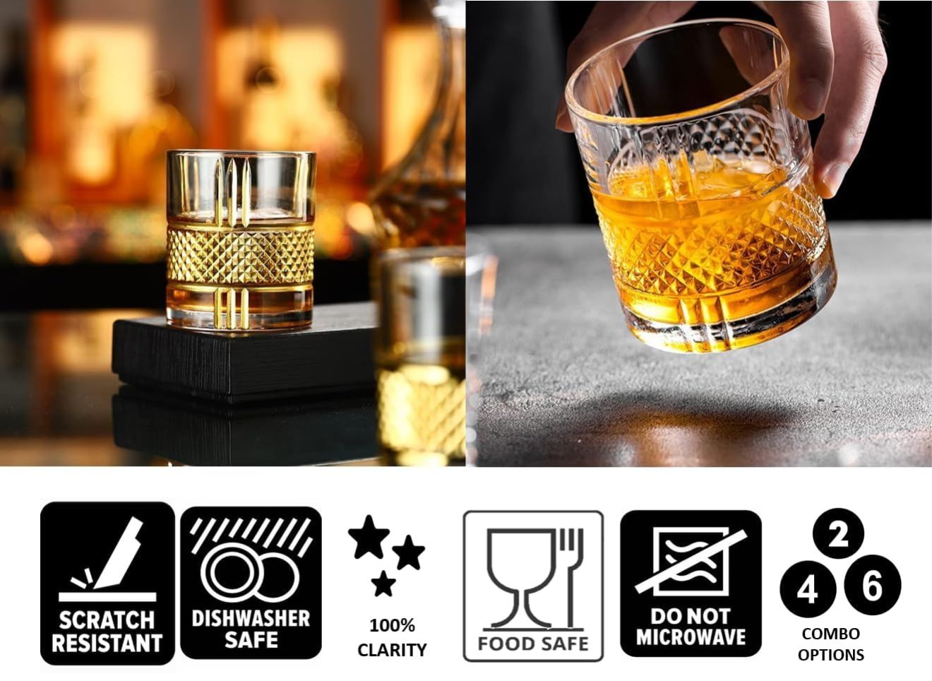 - Premium Quality Unique Glass: Stunning rock style old fashioned cocktail glass set with timeless design. Perfect for serving scotch, whiskey or mixed drinks. Use for drinking your Single Malt, Tennessee Rye, Brandy, Beer, Vodka, Old Fashioned Cocktails, Gin and Tonic or any liquor you like or even as a classy way to serve water or juice at your dining table.