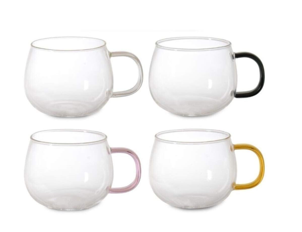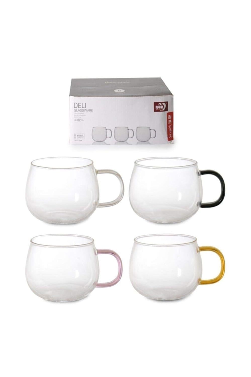 Set of 4, Heat-Resistant Borosilicate Glass Tea Coffee Cup Mug Set with Colorful Handle, 410ml Each, 8X12 cms