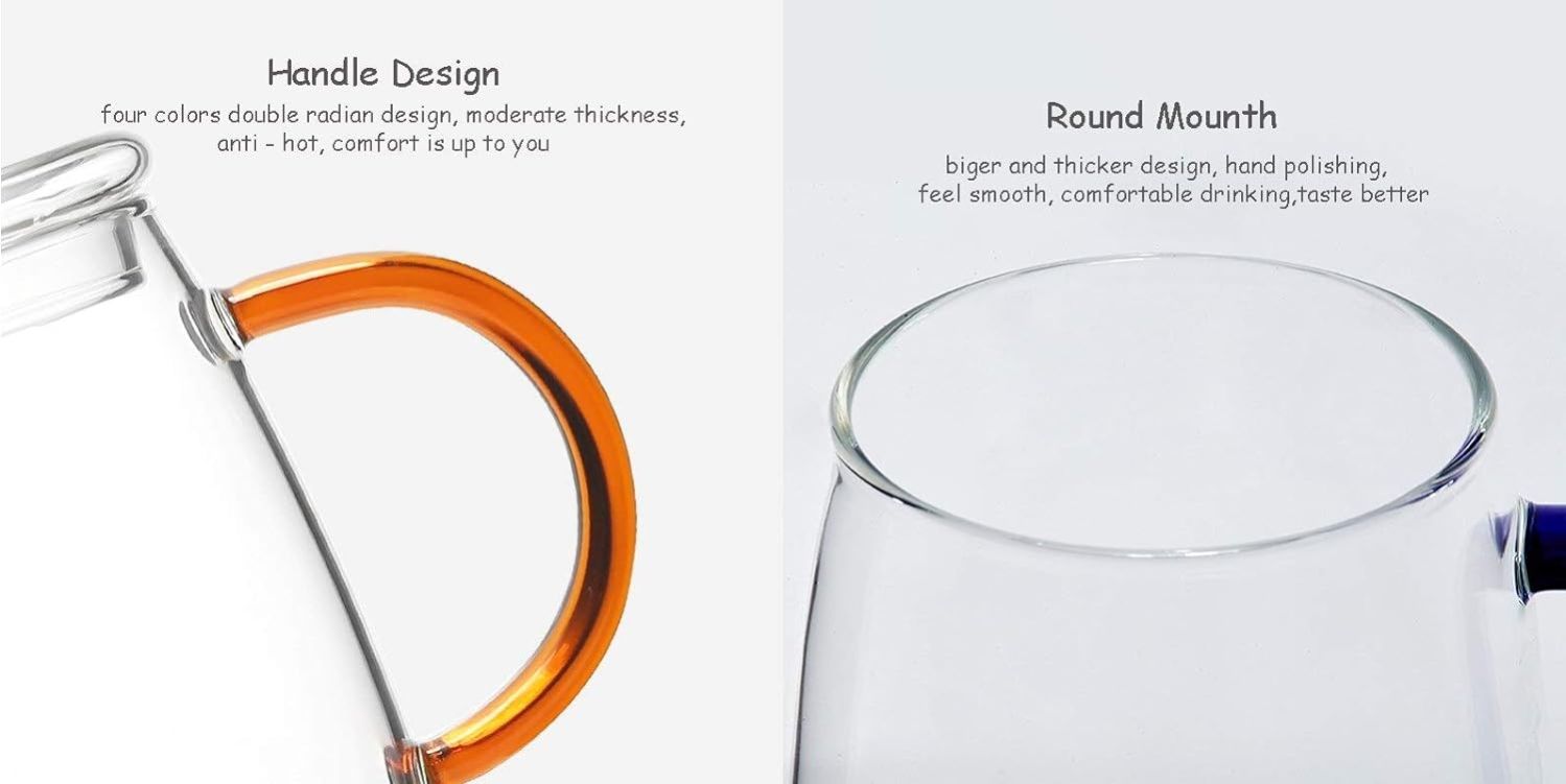 - high boron, lead-free Borosilicate glass, etc. High temperature resistant, safe in use; forged decor, Simple and stylish; wide yellow handle, beautiful atmosphere; large capacity, more convenient drinking water.