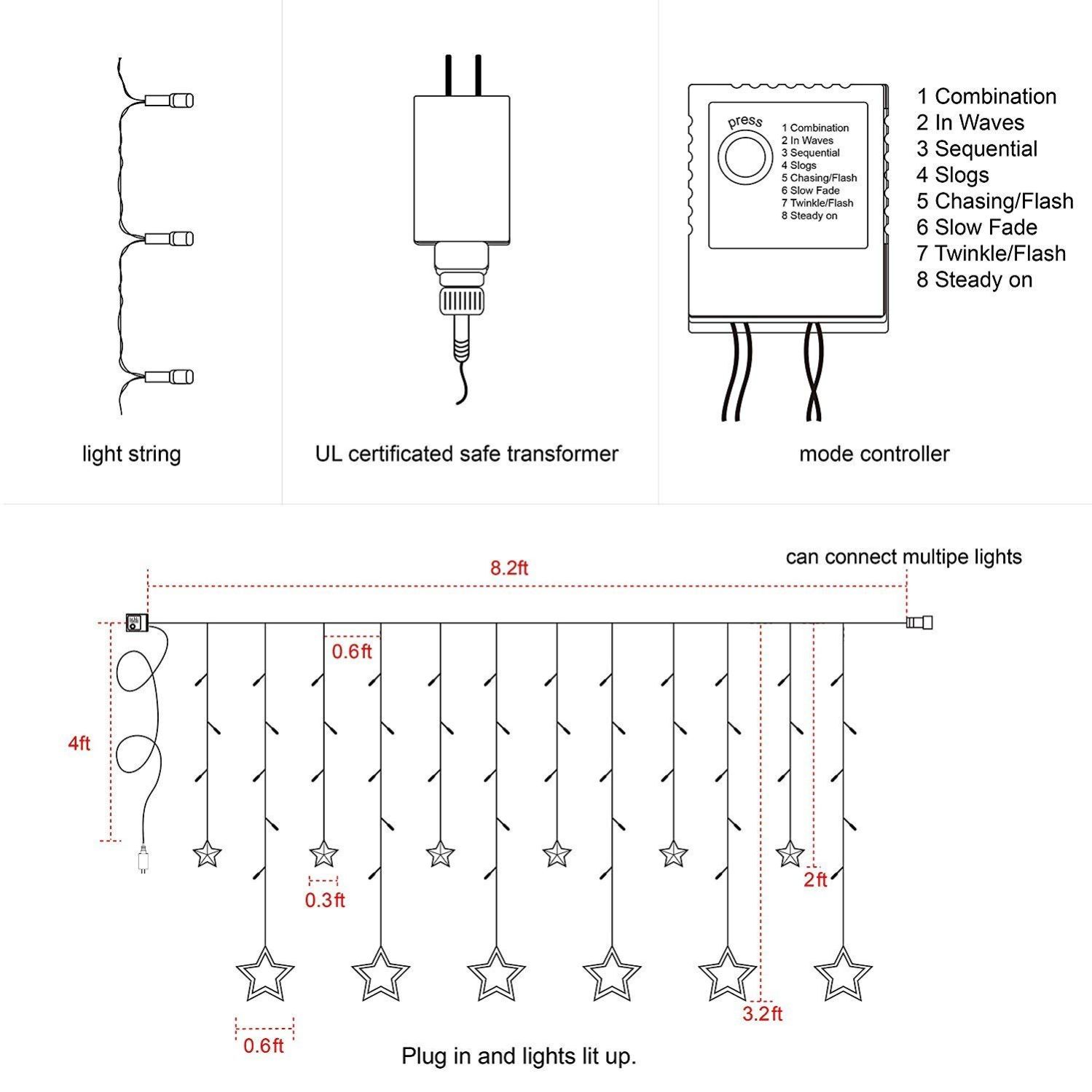 - 8 Lighting Modes : This curtain light is one button control, press the button you can select 8 different modes to meet your diverse needs